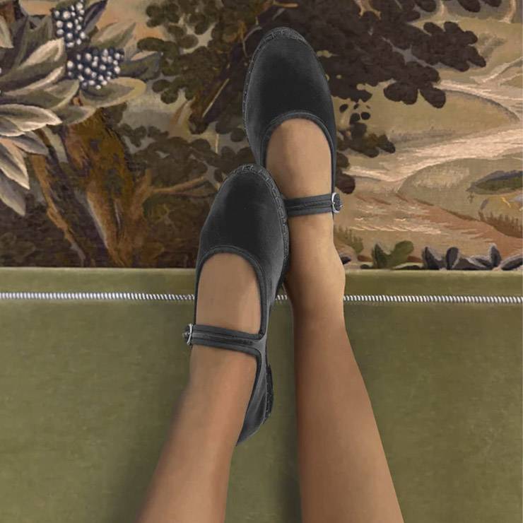 Mercedita de terciopelo de algodón con ribetes y cierre de hebilla. Interior en algodón orgánico con tratamiento antibacteriano. Suela hecha de caucho producido a partir de neumáticos de bicicleta reciclados.