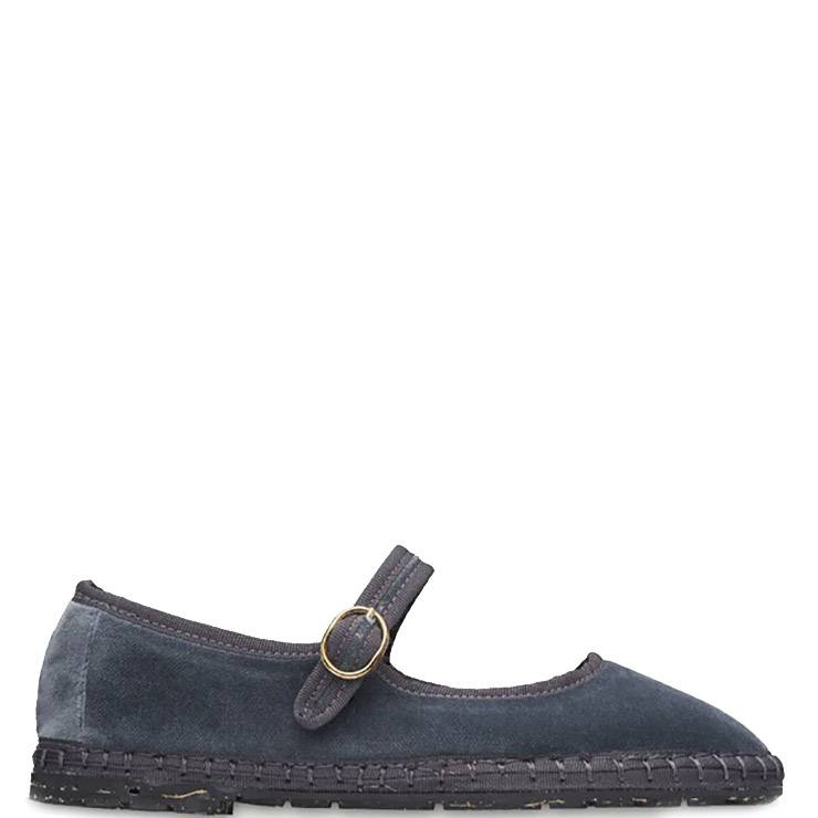 Mercedita de terciopelo de algodón con ribetes y cierre de hebilla. Interior en algodón orgánico con tratamiento antibacteriano. Suela hecha de caucho producido a partir de neumáticos de bicicleta reciclados.
