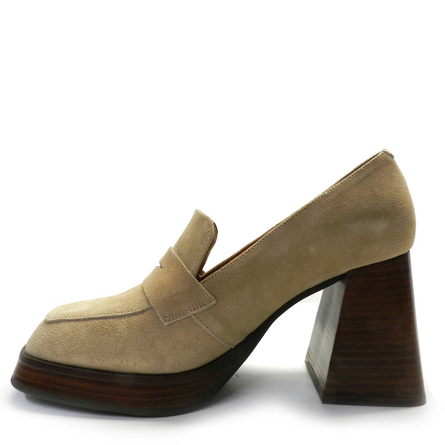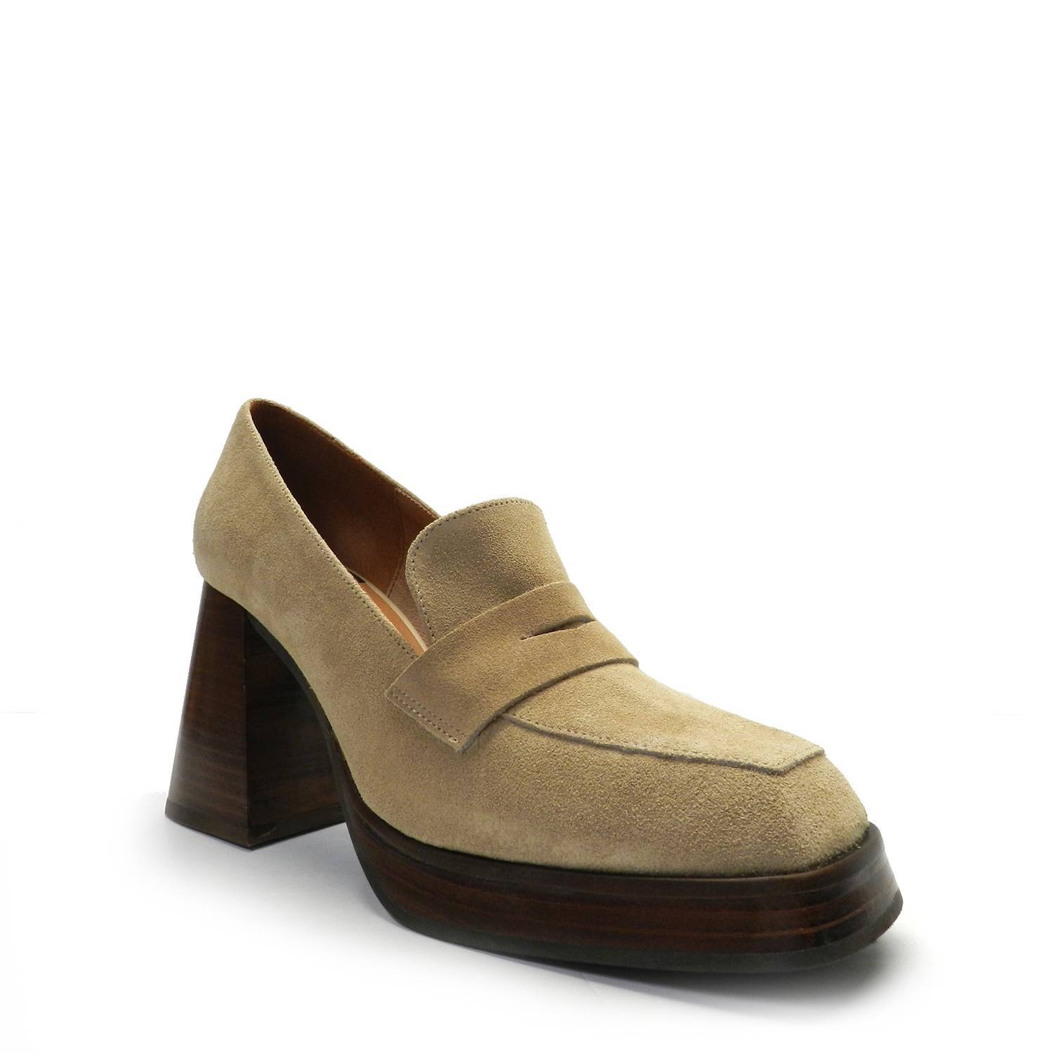 Mocasín de la marca Escala en color arena. Mocasín de ante en color arena con detalle de antifaz en la parte del empeine. Suela antideslizante de plataforma y tacón cuadrado.