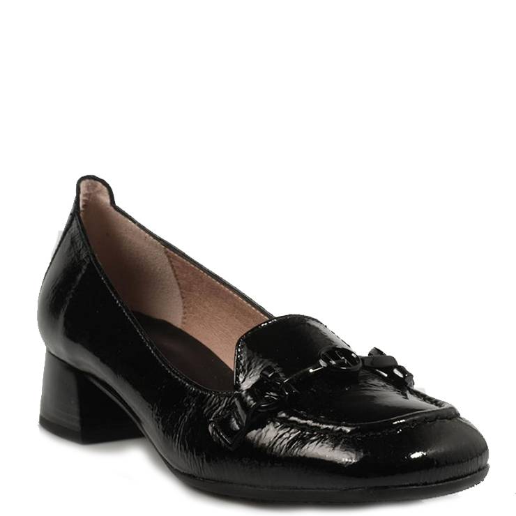 Mocasín de tacón elaborado en charol. Suela de alta calidad con tacón de 3,5 cm. Detalle de eslabón metálico al tono.
