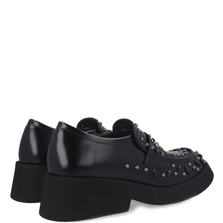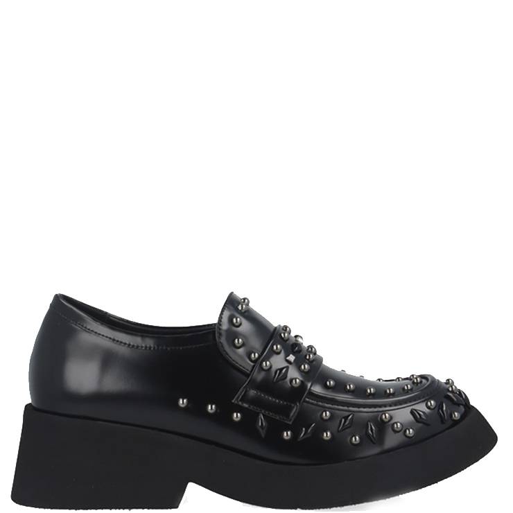 Mocasín elaborado en napa vegana. Detalle de mix de tachuelas. Suela de goma EVA de 2 cm y tacón bloque de 5 cm.