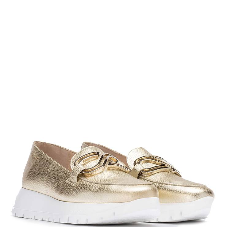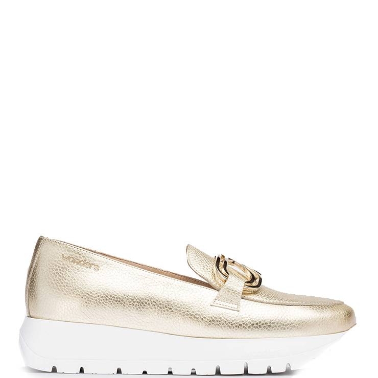 Mocasín en piel grabada metalizada. Punta redondeada, detalle frontal en forma de cadena metalizada. Plantilla extraíble. Suela dentada desarrollada con tecnología WondersFly. Suela de goma EVA expandida de 2,5 cm de altura.