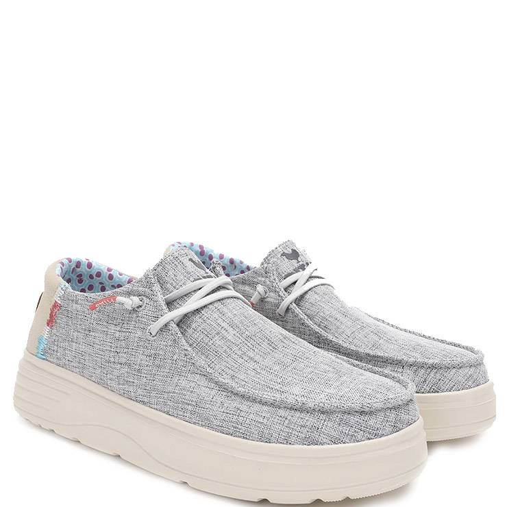 Náutico tipo wallabi elaborado en textil jaspeado. Detalles bordados y trasera en serraje. Plantilla extraíble en EVA forrada en piel. Suela EVA ultraligera de 4,5 cm. Cierre con cordones elásticos.