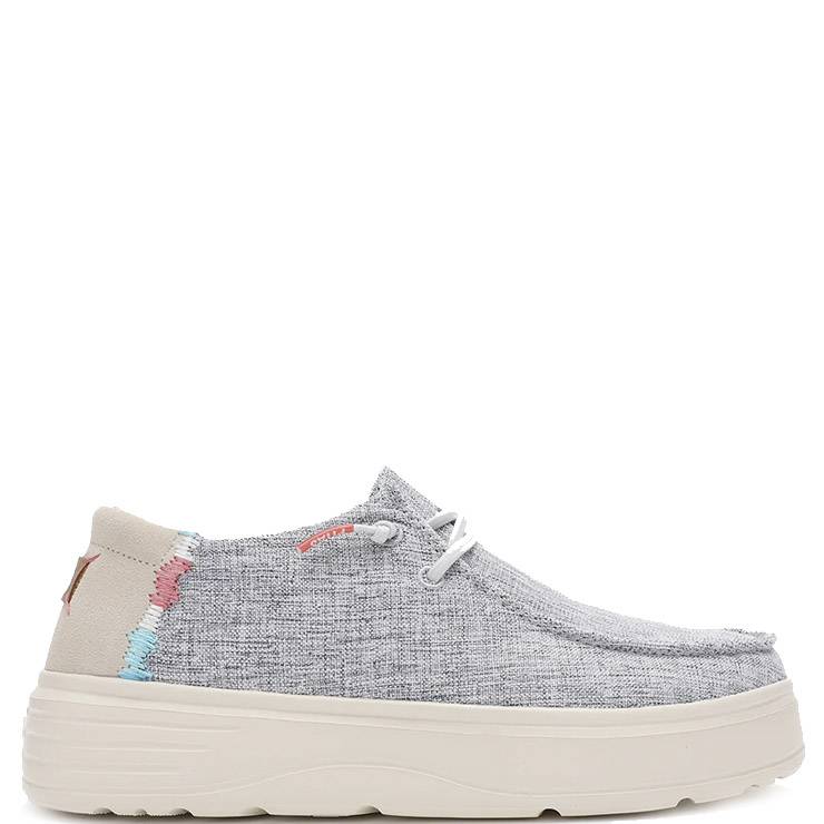 Náutico tipo wallabi elaborado en textil jaspeado. Detalles bordados y trasera en serraje. Plantilla extraíble en EVA forrada en piel. Suela EVA ultraligera de 4,5 cm. Cierre con cordones elásticos.