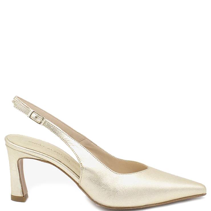 Salón destalonado en piel metalizada. Tacón fino de 6,5 cm de altura. Cierre ajustable con hebilla. Punta afilada.