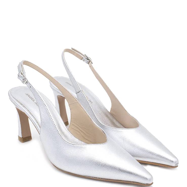 Salón destalonado en piel metalizada. Tacón fino de 6,5 cm de altura. Cierre ajustable con hebilla. Punta afilada.