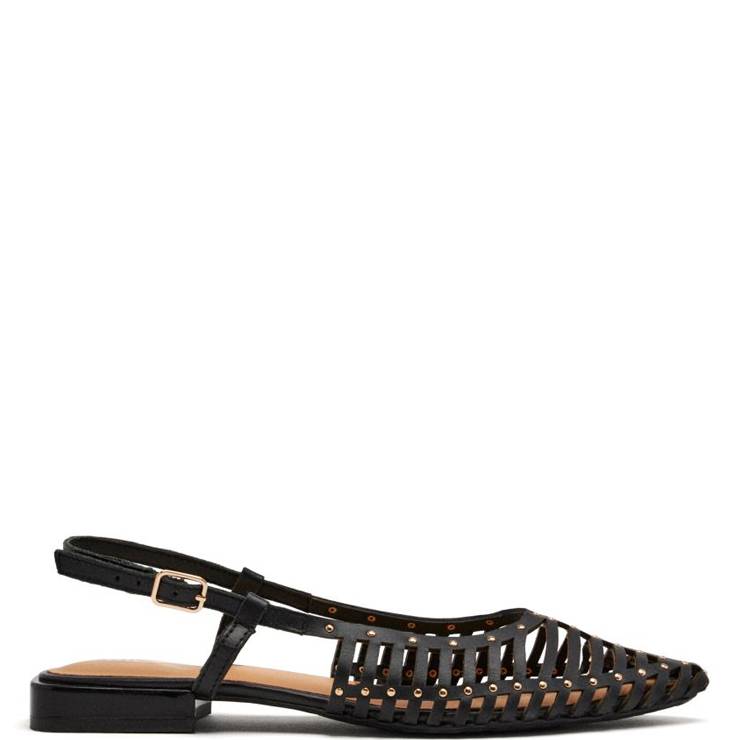 Salón destalonado elaborado en piel calada. Detalle de remaches. Planta acolchada de piel. Punta afilada. Tacón bloque de 1 cm. Cierre con hebilla en el tobillo.