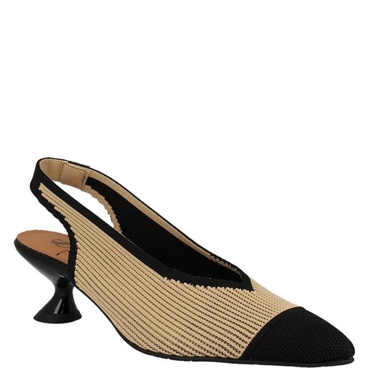 Salón destalonado en tejido eco-elástico ajustable. Punta fina. Tacón chupete de 2,5 cm. Plantilla acolchada. Suela de goma. Elástico trasero.