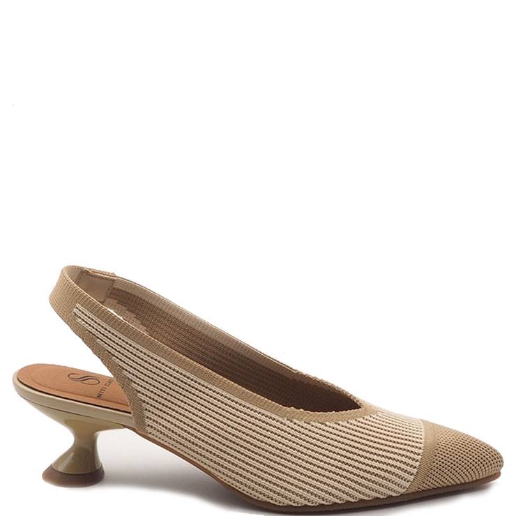 Salón destalonado en tejido eco-elástico ajustable. Punta fina. Tacón chupete de 2,5 cm. Plantilla acolchada. Suela de goma. Elástico trasero.
