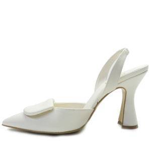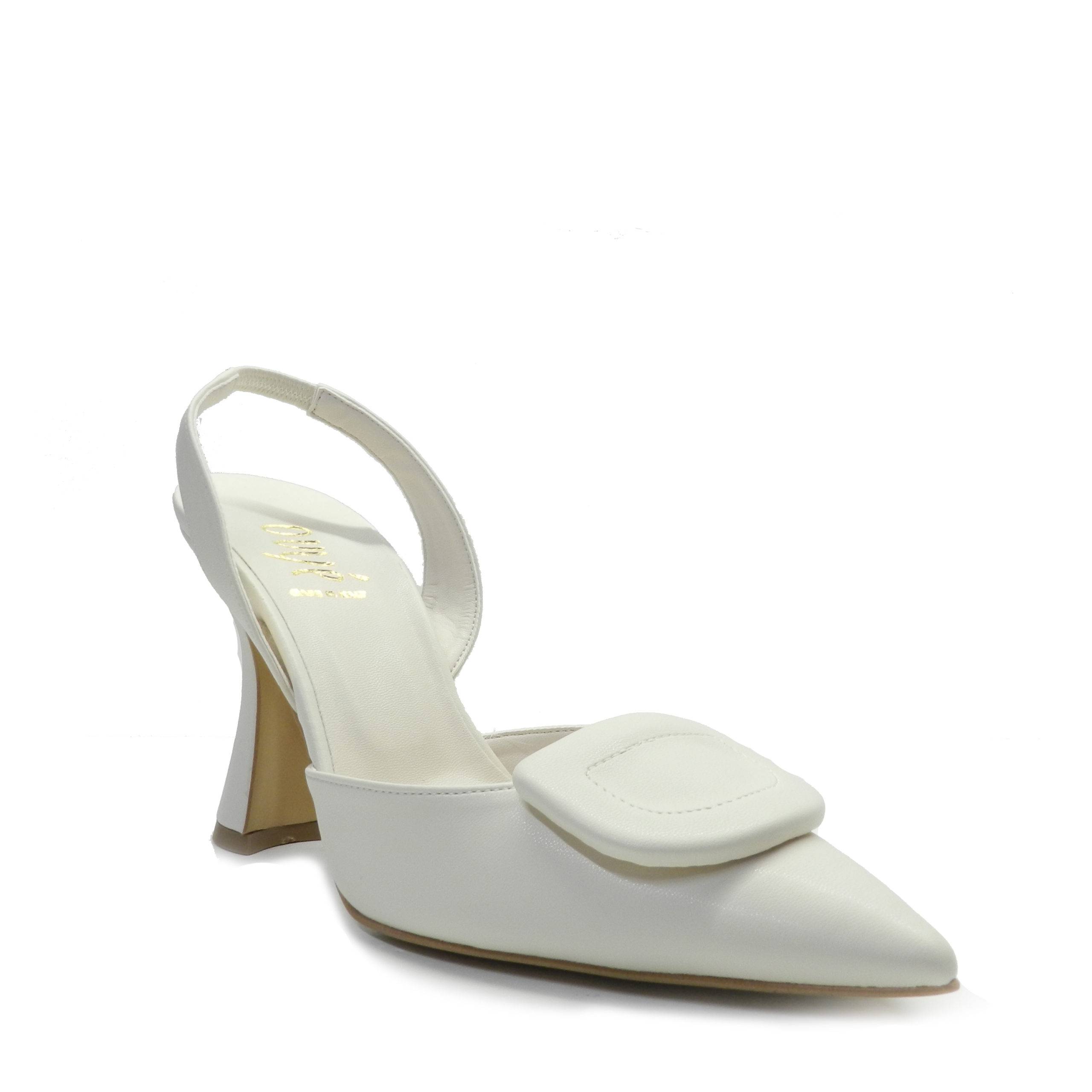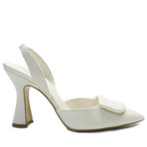 Salón de la marca Ovye, modelo LF41 de color blanco. Cerrada de la punta con forma triangular y decoración en la parte delantera. Tira de sujeción en la parte trasera con elástico. Tacón estilo retro.