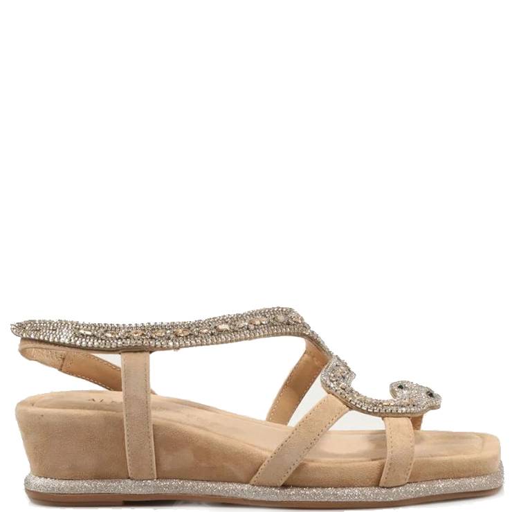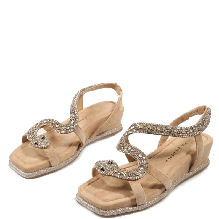 Sandalia de cuña media elaborada en ante. Detalle de pedrería en el empeine en forma de serpiente. Suela de goma con detalle glitter. Cuña de 3 cm de altura.