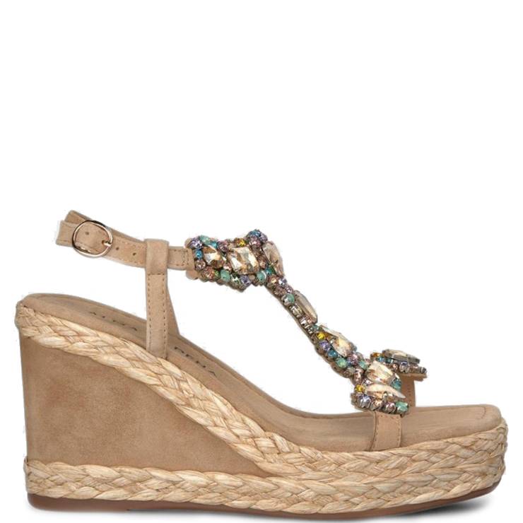 Sandalia de cuña alta elaborada en ante. Detalle de pedrería multicolor en el empeine. Cierre con hebilla ajustable en el tobillo. Suela acolchada con cuña en ante y rafia trenzada. Cuña de 9,5 cm de altura.