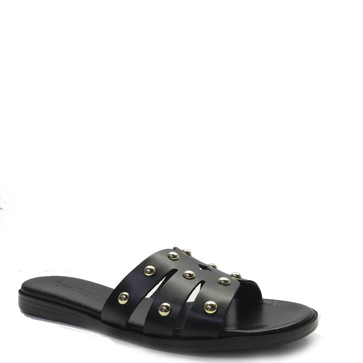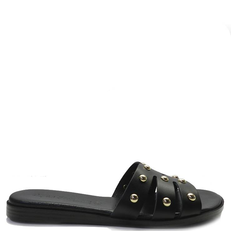 Sandalia plana de piel con tachas en dorado. Banda ancha troquelada y planta acolchada de piel. Muy cómoda y perfecta para cualquier ocasión.