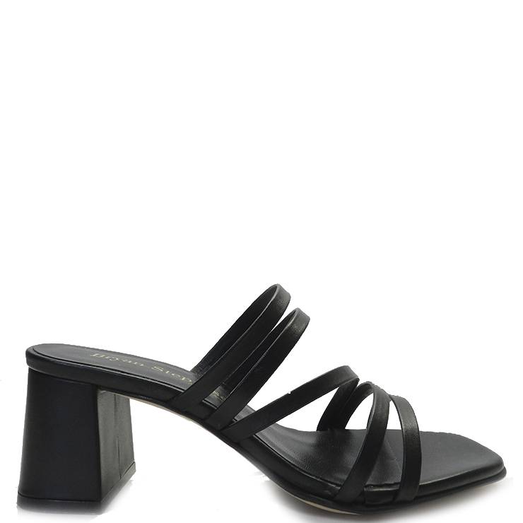 Sandalia de tacón con finas tiras simétricas de piel. Plantilla acolchada en piel. Tacón ancho de 6,5 cm de altura.
