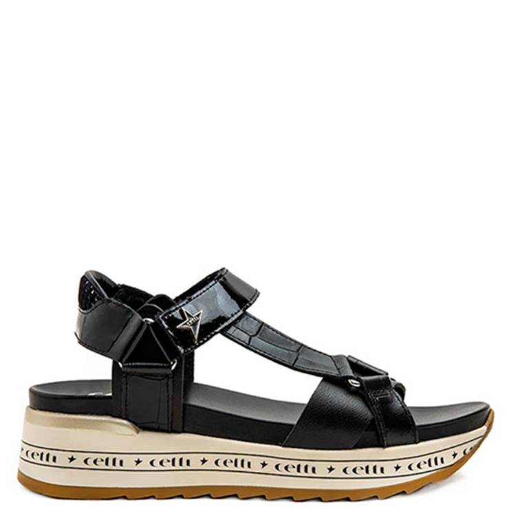 Sandalia de la marca Cetti, modelo C-1263 en color negro. Sandalia de piel con tiras en combinación de materiales estampados en animal print. Cierre de velcro. Suela de goma deportiva con estampado con el logo en la entresuela.