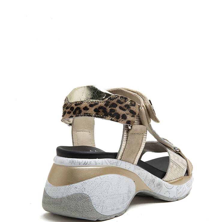Sandalias con cuña elaborada en piel en combinación de diferentes texturas y estampados. Tiras ajustables con velcro. Suela de goma deportiva con cuña de 7 cm de altura.