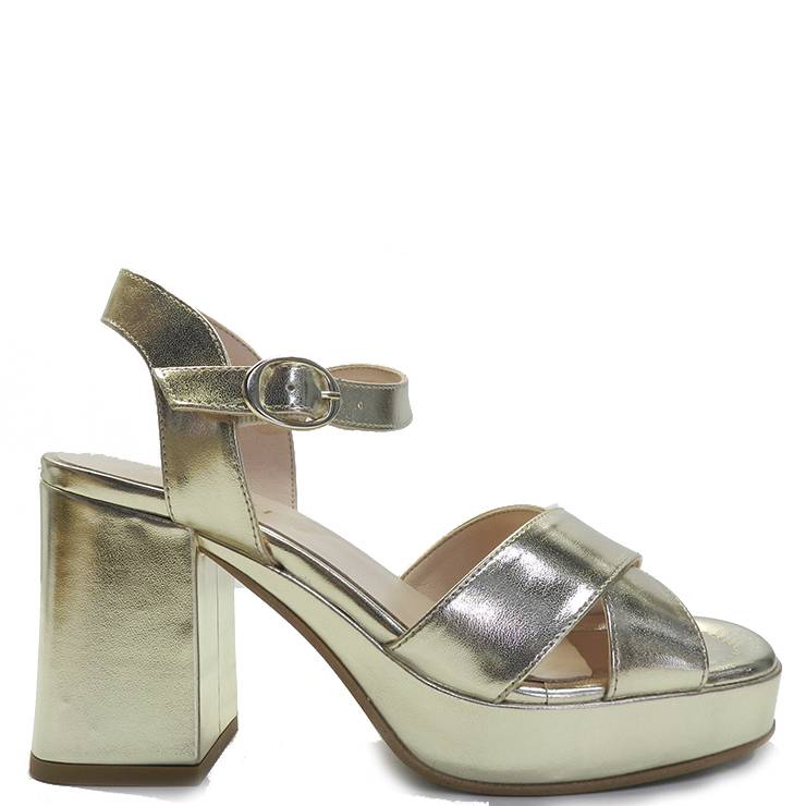 Sandalia de tacón con tiras anchas cruzadas en piel metalizada. Cierre con hebilla en el tobillo. Tacón ancho de 7 cm y 2 de plataforma.