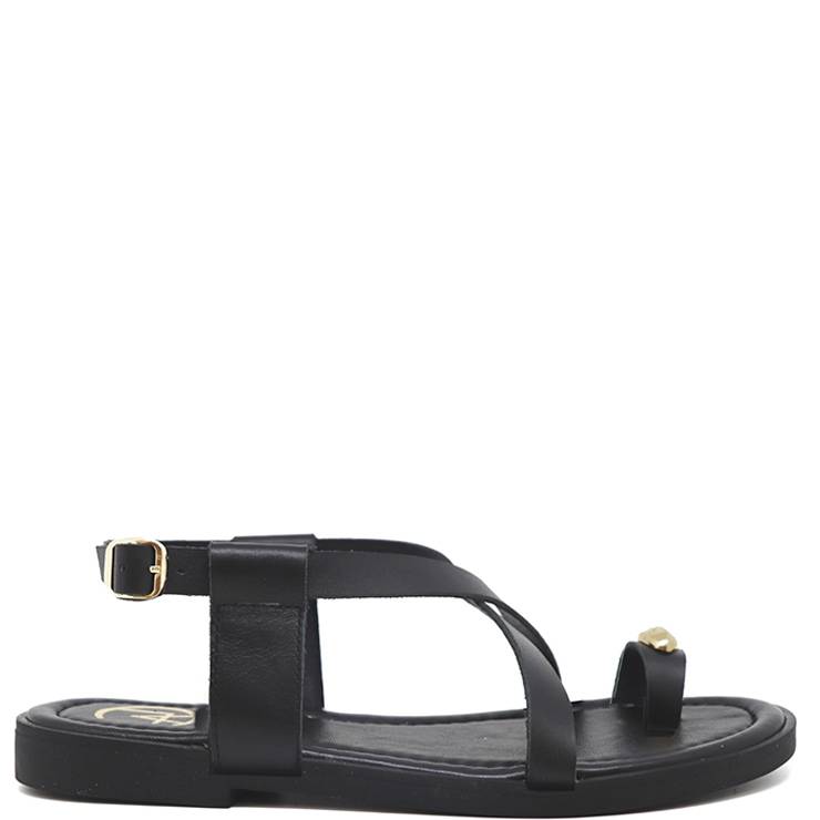 Sandalia plana de piel estilo bikini. Tiras cruzadas en el empeine. Detalle de adorno para el dedo. Suela de goma antideslizante. Cierre ajustable con hebilla en la parte trasera del tobillo.
