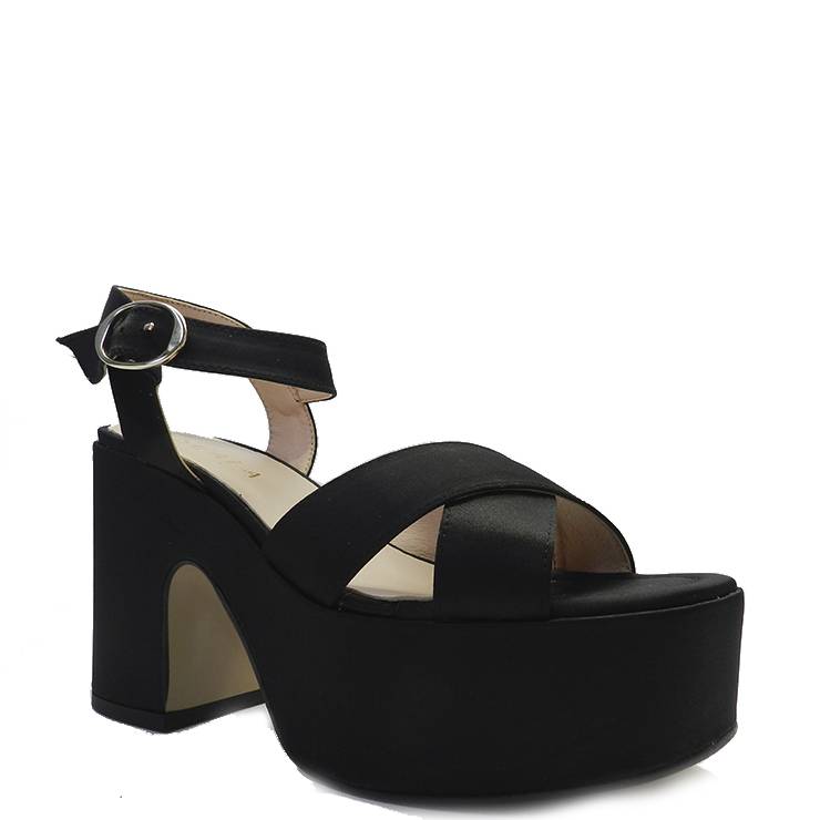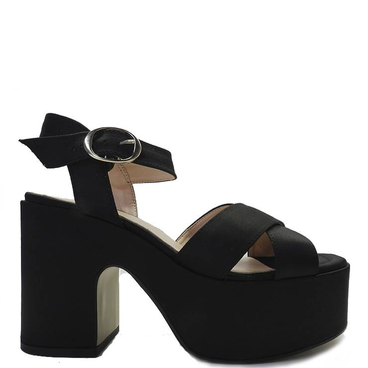 Sandalia de tacón con tiras anchas cruzadas en raso. Cierre con hebilla en el tobillo. Tacón ancho de 6 cm y 4 de plataforma.