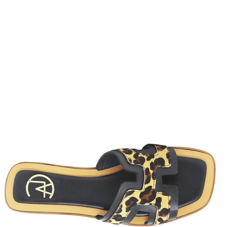 Sandalia plana tipo chancla de piel y potro. Banda ancha en H en bicolor. Planta acolchada de piel. Suela de goma antideslizante.