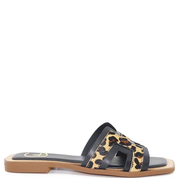 Sandalia plana tipo chancla de piel y potro. Banda ancha en H en bicolor. Planta acolchada de piel. Suela de goma antideslizante.