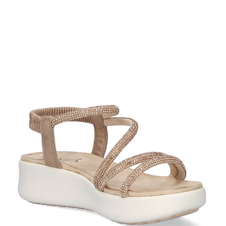 Sandalia de tiras elaborada en material sintético con detalle de strass. Ajuste elástico en la parte trasera. Suela de goma con cuña de hasta 4, 5 cm de altura.