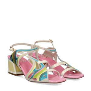 Sandalias de la marca Exe, modelo Luisa 335 en color ice con detalles multicolor. Sandalia de material sintético con tacón bajo cuadrado y cierre con hebilla. Sus tiras llevan dos bordados en forma de peces con rayas multicolor. Altura del tacón de 3 cm y plantilla de piel.