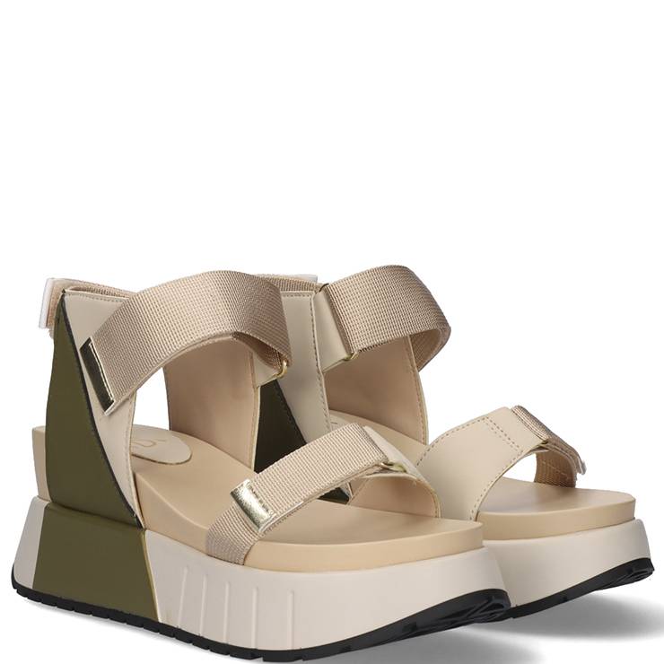 Sandalia con plataforma de tiras ajustables. Tiras con cierre de velcro en tejido textil multicolor y detalle en kaki. Suela de plataforma bicolor de 7 cm de altura.