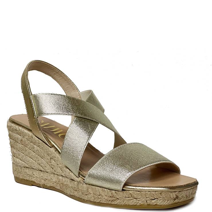 Sandalia elaborada en napa metalizada. Tiras cruzadas elásticas en el empeine. Cuña de yute de 5 cm de altura.