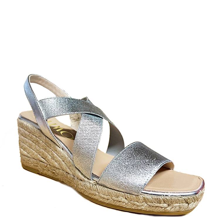 Sandalia elaborada en napa metalizada. Tiras cruzadas elásticas en el empeine. Cuña de yute de 5 cm de altura.