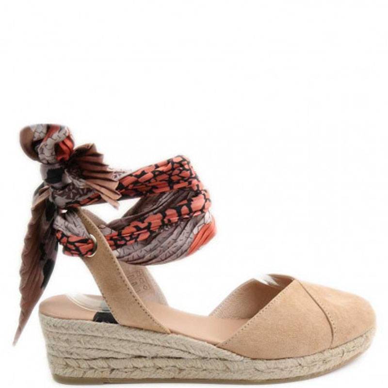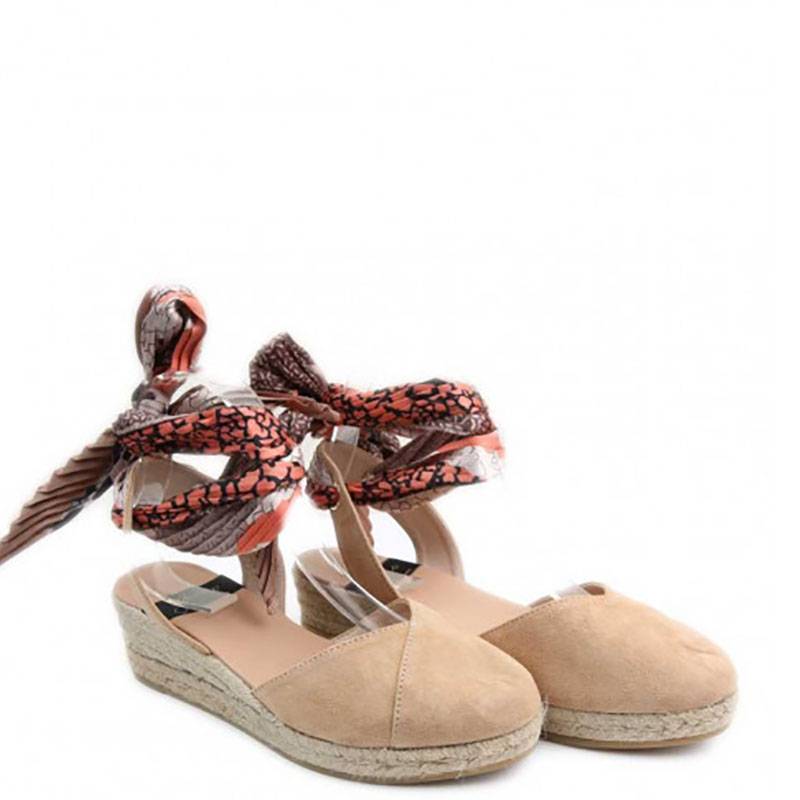 Sandalia de la marca Gaimo, modelo Michelle en color arena. Estas sandalias tienen una altura de 4,4cm formada por una bonita cuña de yute 100% ecológico. Confeccionadas en ante con corte cerrado y talonera con cierre mediante cintas con estampado anudadas al tobillo.