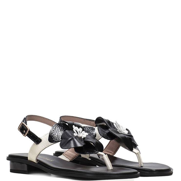 Sandalia plana tipo bikini en piel de bovino. Detalle de adorno de flor en el empeine. Tecnología Triflow de triple almohadillado. Suela de PU Termoplástico. Cómodo tacón ancho de 2,5 cm.