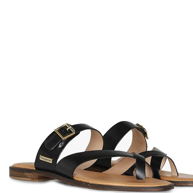Sandalias planas de cuero liso. Tiras entrecruzadas entre los dedos. Ajustable con hebilla dorada. Pequeña placa en el lateral. Suela plana y tacón de 1 cm.