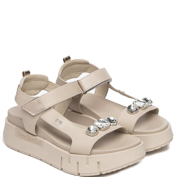 Sandalia elaborada en piel y material técnico. Detalle de pedrería. Suela de goma con plataforma de 4 cm de altura. Cierre ajustable con velcro.