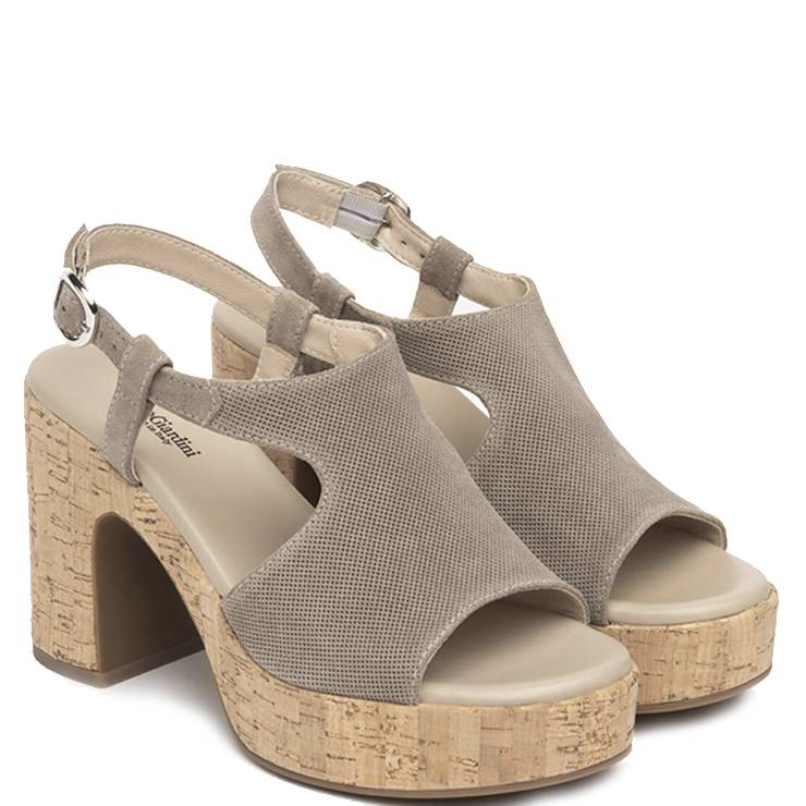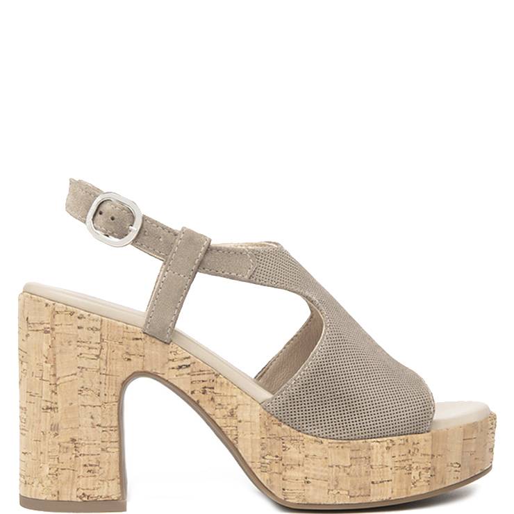 Sandalia elaborada en ante picado. Cierre con hebilla. Tacón de corcho de 10,5 cm de altura y plataforma 3 cm. Suela de goma antideslizante.