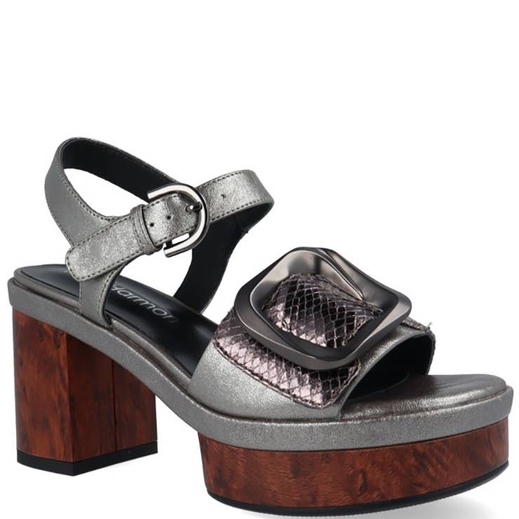 Sandalia de tacón tipo pala con maxi hebilla y detalle de contraste. Cierre ajustable en el tobillo con pulsera y hebilla. Tacón de 9 cm de altura y plataforma en efecto madera. Suela de goma.