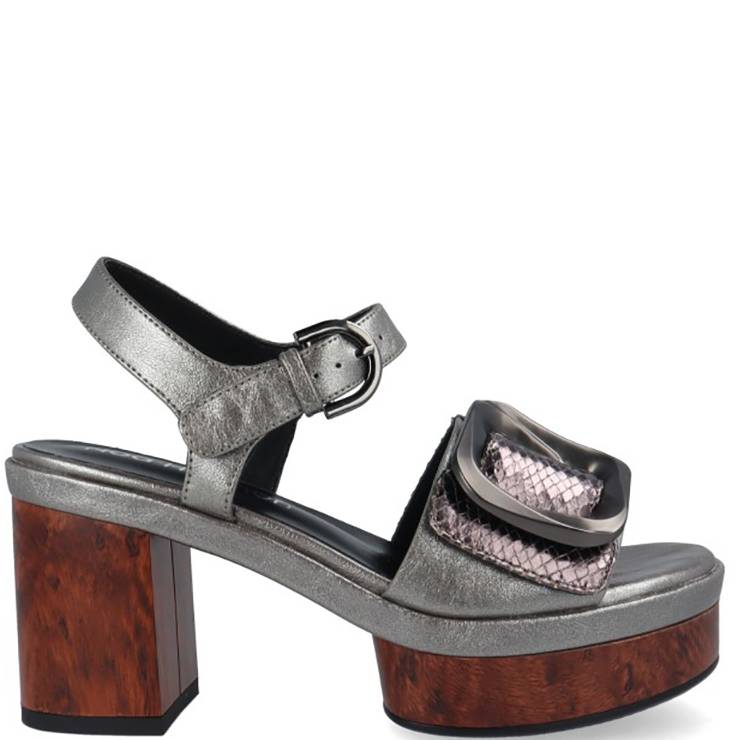 Sandalia de tacón tipo pala con maxi hebilla y detalle de contraste. Cierre ajustable en el tobillo con pulsera y hebilla. Tacón de 9 cm de altura y plataforma en efecto madera. Suela de goma.