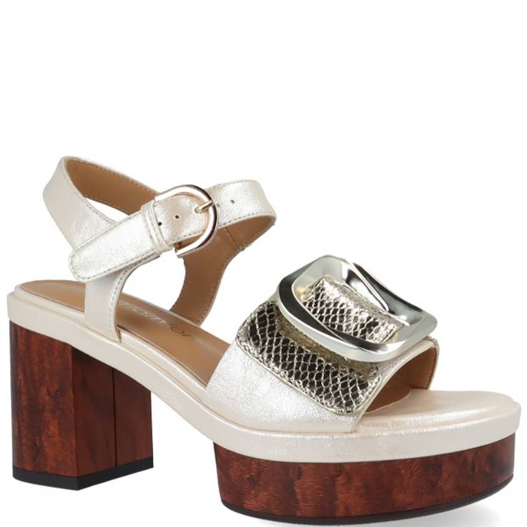 Sandalia de tacón tipo pala con maxi hebilla y detalle en contraste. Cierre ajustable en el tobillo con pulsera y hebilla. Tacón de 9 cm de altura y plataforma en efecto madera. Suela de goma.