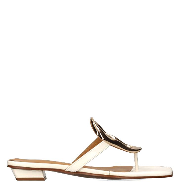 Sandalia de dedo con efecto piel de coco. Detalle de pieza grande en color oro en el empeine a modo de decoración. Plantilla de piel acolchada. Modelo acabado con punta cuadrada. Tacón de 1 cm de altura.