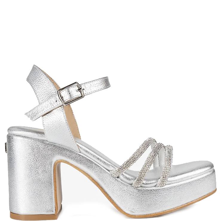 Sandalia elaborada en material sintético metalizado. Detalle de tiras brillantes en la pala. Cierre ajustable con hebilla en el tobillo. Suela forrada al tono con tacón de 9 cm y plataforma de 3 cm.