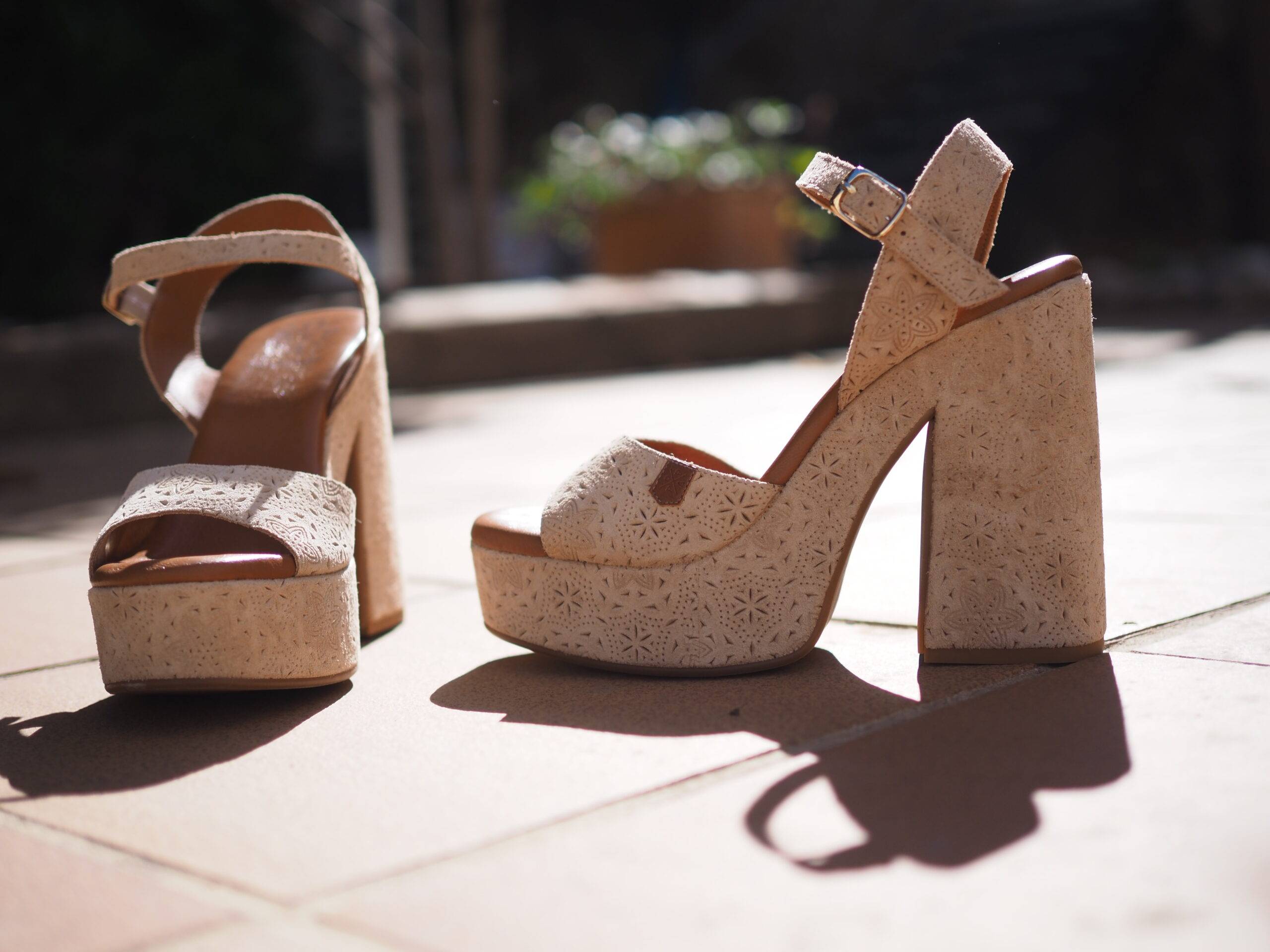 Sandalia elaborada en serraje. Detalle de flores caladas. Cierre ajustable con hebilla en el tobillo. Tacón de 13 cm y plataforma de 3,5 cm de altura.