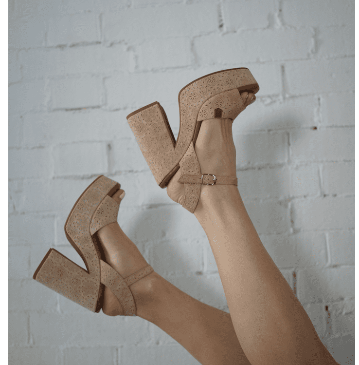 Sandalia elaborada en serraje. Detalle de flores caladas. Cierre ajustable con hebilla en el tobillo. Tacón de 13 cm y plataforma de 3,5 cm de altura.