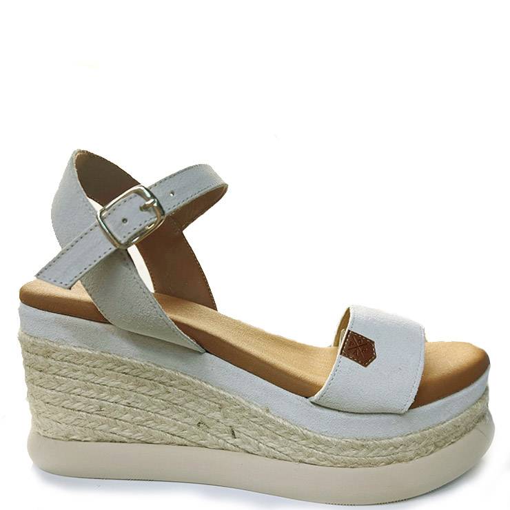 Sandalia de cuña elaborada en ante. Cierre de hebilla en el tobillo. Tira ancha. Logotipo grabado. Plantilla acolchada. Cuña de esparto con suela de goma. Plataforma de 5 cm y cuña de 9 cm de altura.