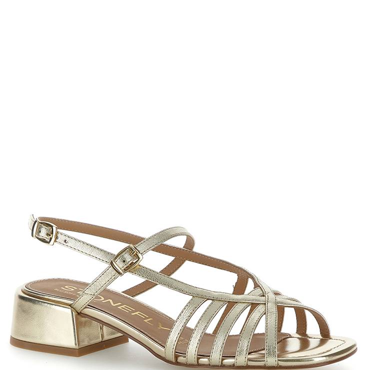 Sandalia de tiras finas de piel metalizada. Cierre con doble hebilla. Tacón ancho de 3 cm de altura.