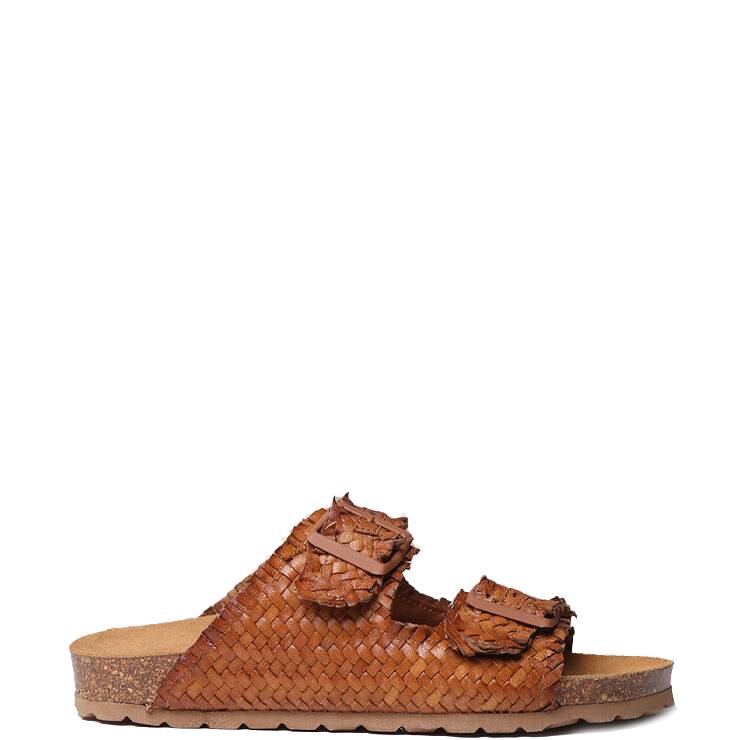 Sandalia tipo bio elaborada en piel trenzada. Suela de corcho y goma EVA de 2,5 cm de altura. Planta forrada en serraje. Dos tiras superiores con hebillas ajustables.