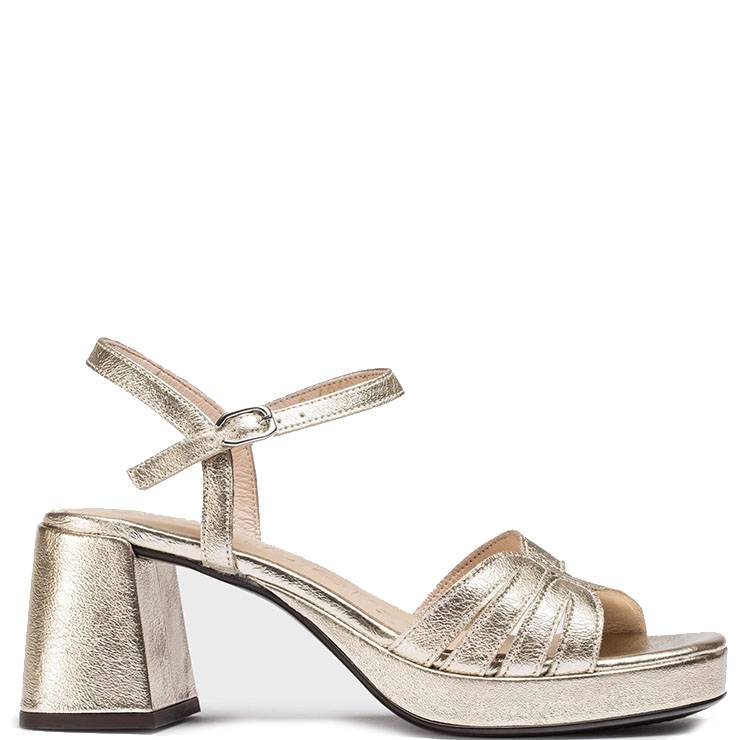 Sandalias de tacón elaboradas en piel metalizada con multi tiras redondeadas. Suela de PU flexible. Plantilla interior de MemoryGel. Tacón bloque de 7 cm de altura. Cierre ajustable con hebilla.