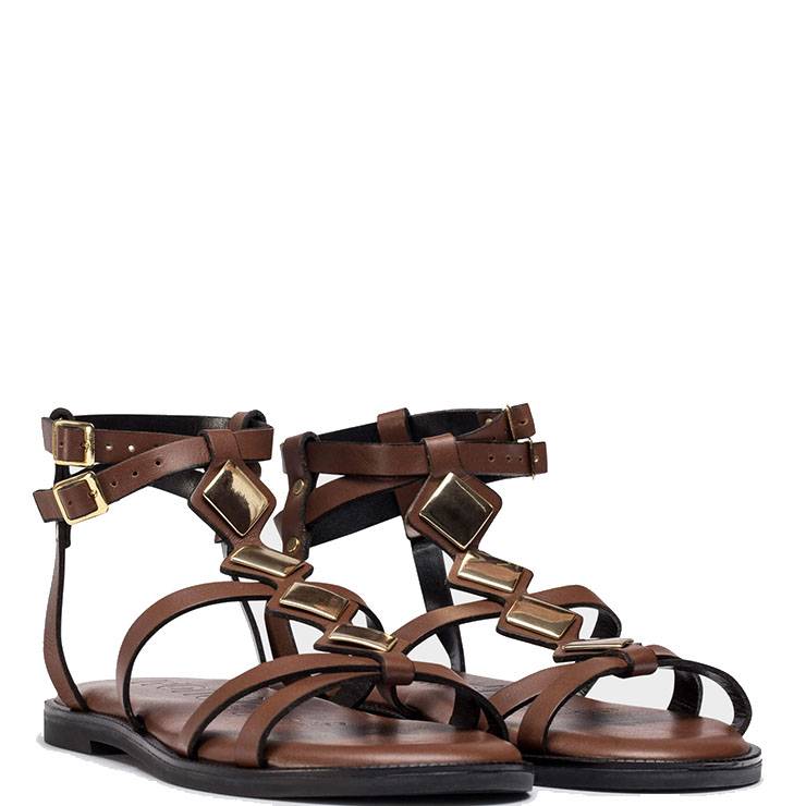 Sandalia plana tipo romana elaborada en cuero. Suela en TPU. Detalles metálicos en el empeine. Cierre con doble hebilla en el tobillo. Plantilla MemoryGel.