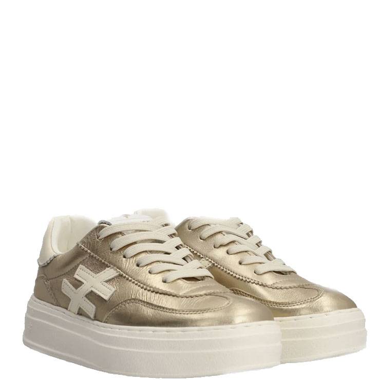 Zapatillas deportivas elaboradas en piel metalizada. Suela de goma de 4 cm de altura. Cierre con cordones.