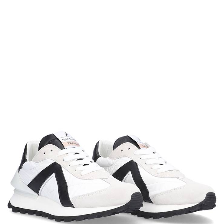 Zapatillas deportivas elaboradas en piel y nylon. Detalles en contraste en negro. Suela dentada de goma y micro reciclada de 4 cm de altura.
