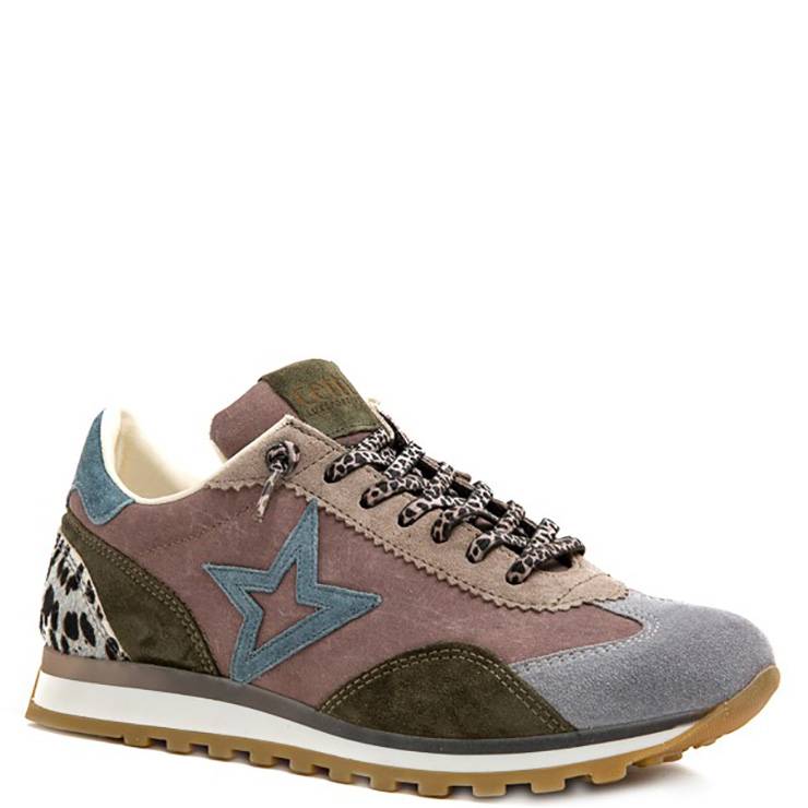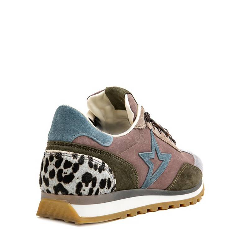 Zapatillas deportivas elaboradas en serraje y tejido en combinación de colores con detalle en animal print. Plantilla de piel acolchada. Suela de goma con patín dentado y cierre de cordones elásticos.